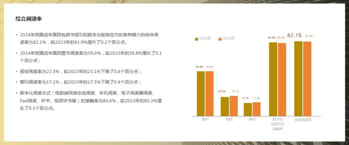 此外,2024年有68.3%的成年国民通过电脑端进行网络在线阅读,较2023年的70.6%下降了2.3个百分点;有23.9%的成年国民在电子阅读器上阅读,比2023年的25.3%减少了1.4个百分点。