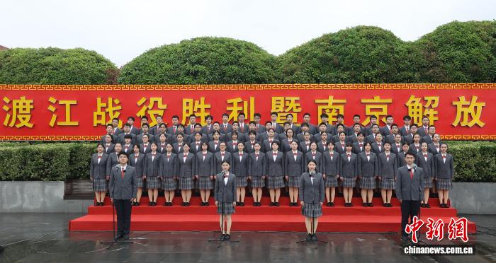 4月23日,江苏南京,庆祝渡江战役胜利暨南京解放77周年升国旗仪式在渡江胜利纪念馆渡江胜利纪念广场举行。图为学生代表朗诵《渡江战歌》。中新社记者 泱波 摄