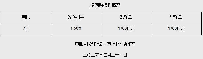 中新网4月21日电 据央行网站消息,4月21日中国人民银行以固定利率、数量招标方式开展了1760亿元逆回购操作。具体情况如下: