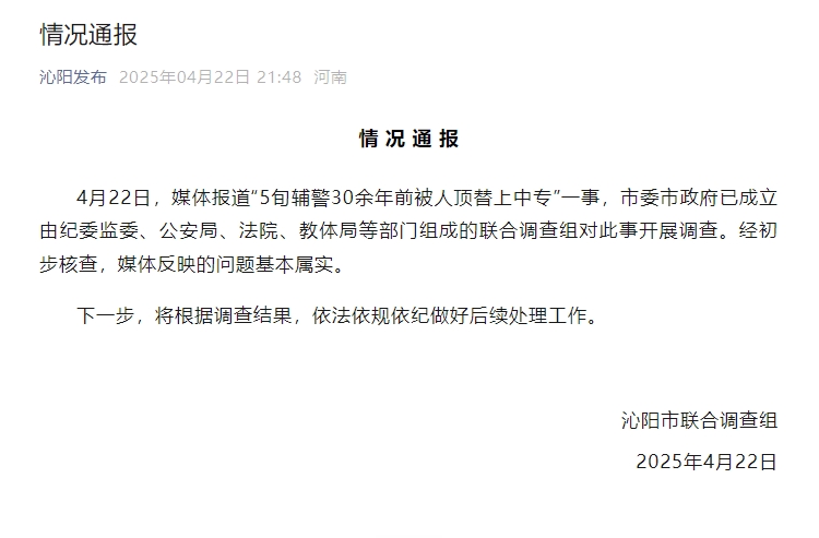 中新网4月23日电 据“沁阳发布”微信公众号消息,河南焦作沁阳市联合调查组22日晚发布情况通报称,4月22日,媒体报道“5旬辅警30余年前被人顶替上中专”一事,沁阳市委市政府已成立由纪委监委、公安局、法院、教体局等部门组成的联合调查组对此事开展调查。经初步核查,媒体反映的问题基本属实。