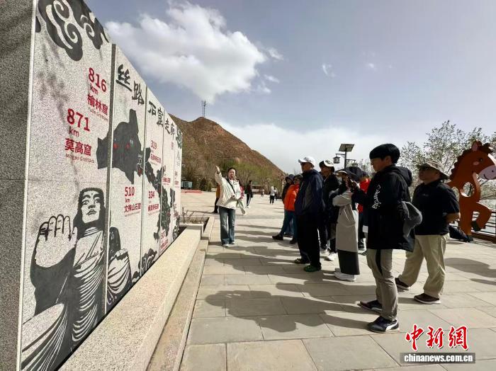 4月22日,甘肃武威,台湾旅行商参观“中国石窟鼻祖”天梯山石窟,感受精湛的古代雕刻与绘画艺术。4月22日至28日,随着丝路游升温,台湾旅行商一行走进甘肃考察踩线,深入感悟丝路魅力,寻觅丝路文旅交流新机遇。图为台湾旅行商观看丝路石窟走廊分布图。闫姣 摄