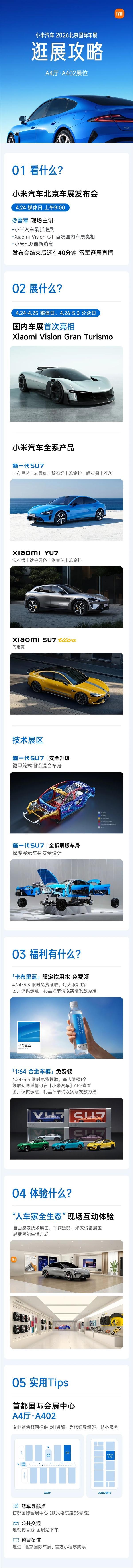 发布会结束后,雷军将进行40分钟的逛展直播,带领观众参观展台亮点。小米展台位于首都国际会展中心A4厅A402展位,现场展出全系车型,包括首次亮相的Vision GT、新一代SU7、YU7以及SU7 Ultra。