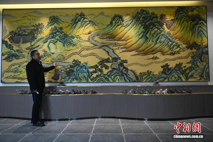 风雨雕石艺画作品形式多样、风格鲜明,既有国画的意境,又有油画的逼真感与立体感。图为制作人介绍大幅风雨雕石艺画作品。高莹 摄