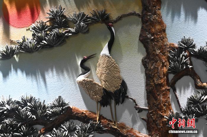图为松鹤题材的风雨雕石艺画作品。高莹 摄