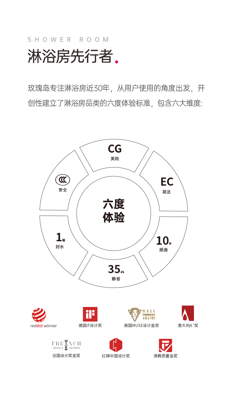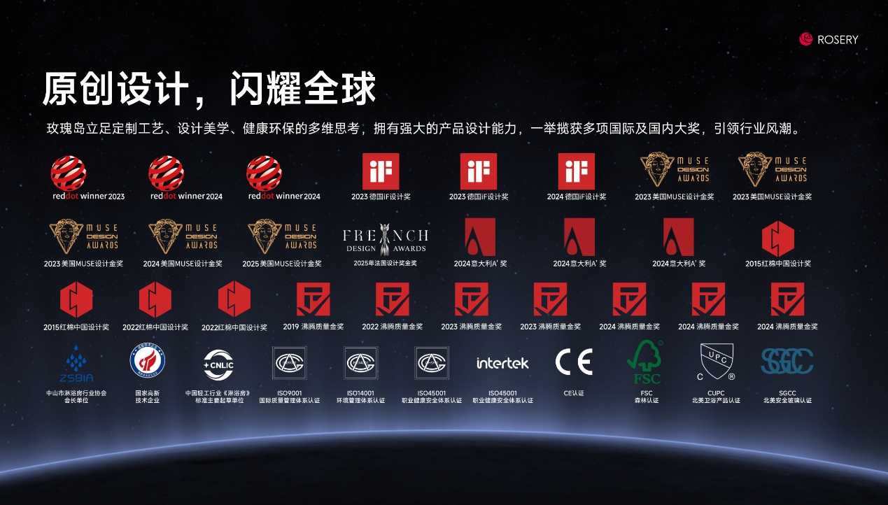 在设计层面,玫瑰岛的产品凭借原创设计与卓越品质,先后斩获德国iF设计奖、德国红点奖、美国缪斯设计奖、意大利A'设计奖、法国设计奖金奖、中国红棉设计奖、中国淋浴房质量金奖等多项国内外权威奖项,在国际舞台展现中国高端卫浴品牌的设计实力。